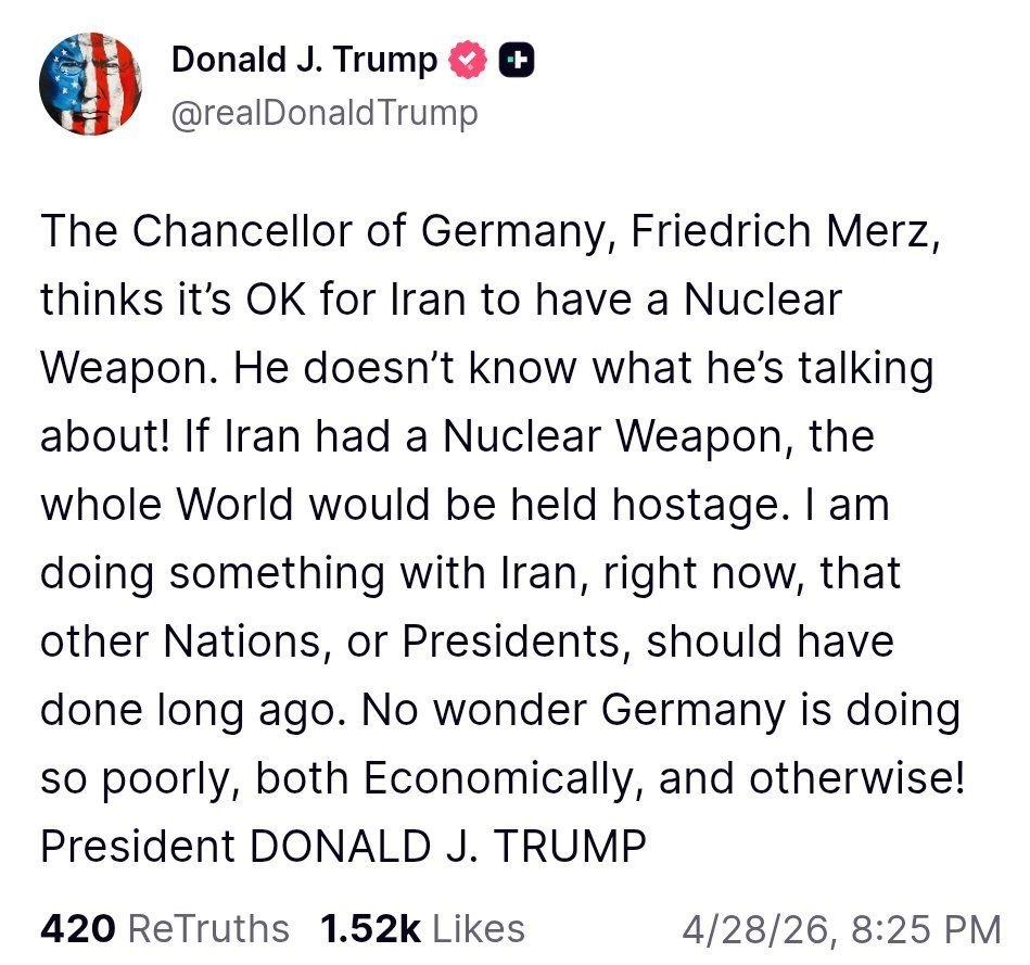 "Der Kanzler Deutschlands, Friedrich Merz, denkt, es sei okay für Iran, eine Atomwaffe zu haben. Er weiß nicht, worüber er spricht. Wenn Iran eine Atomwaffe hätte, würde er die ganze Welt als Geisel nehmen. Ich mache jetzt etwas mit Iran, was andere Nationen oder Präsidenten schon lange hätten machen sollen. Kein Wunder, dass es Deutschland sowohl wirtschaftlich als auch in anderer Hinsicht so schlecht geht."